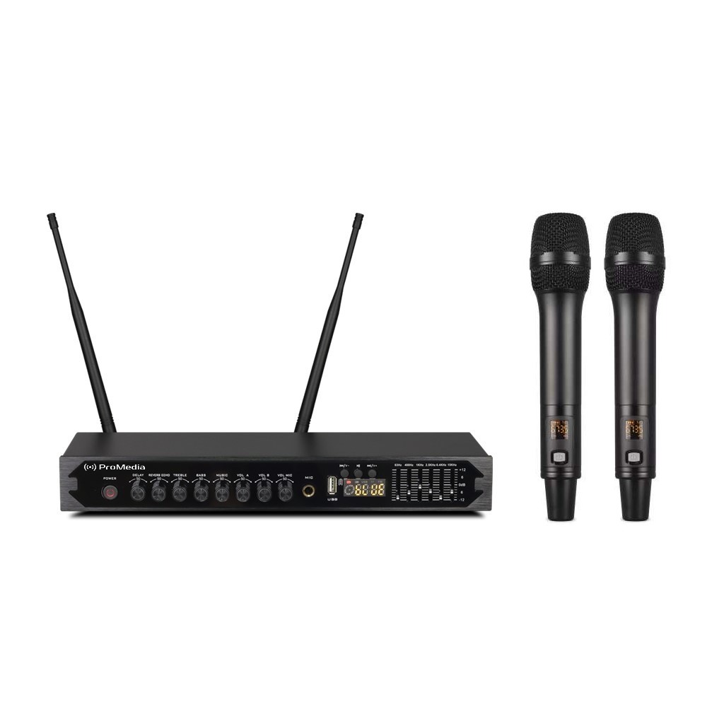 Караоке микшер ProMedia KE-2 состоящая из 2-х беспроводных вокальных микрофонов на аккумуляторах, с возможностью подключения дополнительного микрофона посредством провода. Оснащена USB разъемом для подключения флешек. Благодаря наличию Bluetooth-соединения караоке микшер ProMedia KE-2 легко использовать для воспроизведения караоке с YouTube, Smart TV. Также к нему можно подключать любые смартфоны, планшеты и ноутбуки на базе IOS или Android для беспроводной передачи аудио сигнала